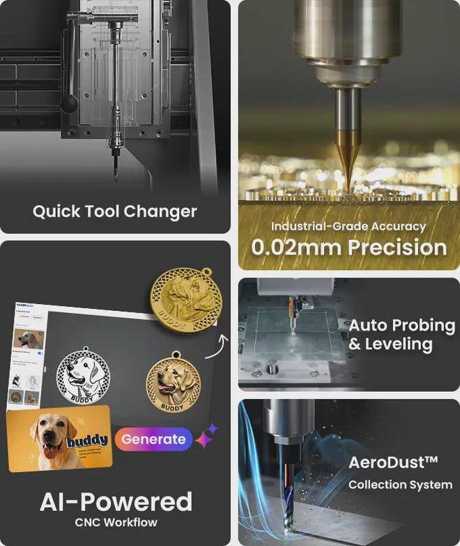 更重要的是,其精度高达0.02毫米,且上手门槛极低:自动调平、快速换刀、一键校准,搭配自研CAM软件,内置材料、刀具与工艺模板,导入模型即可一键生成加工路径,小白也能直接用。