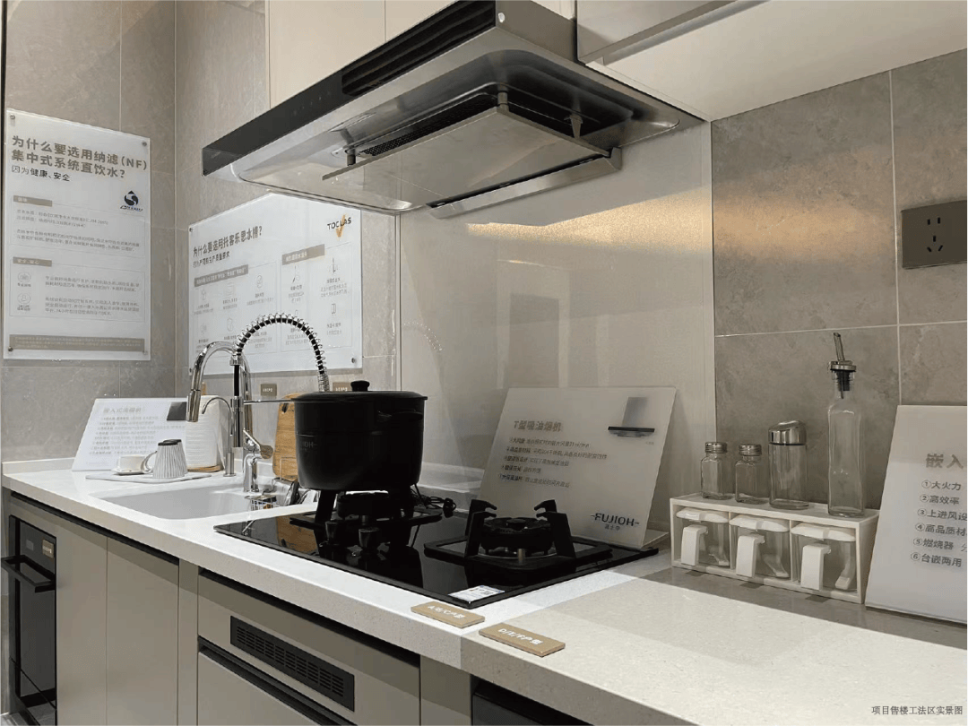 客厅铺的是环保且适用于地暖的大建地板,墙上贴的是能擦拭、抗菌防污的东理墙纸。厨房配置堪称豪华:人造石大单槽无缝拼接好打理,托客乐思的抽拉式水龙头,富士帝的烟灶、洗碗机和蒸烤一体机,让烹饪变成享受。